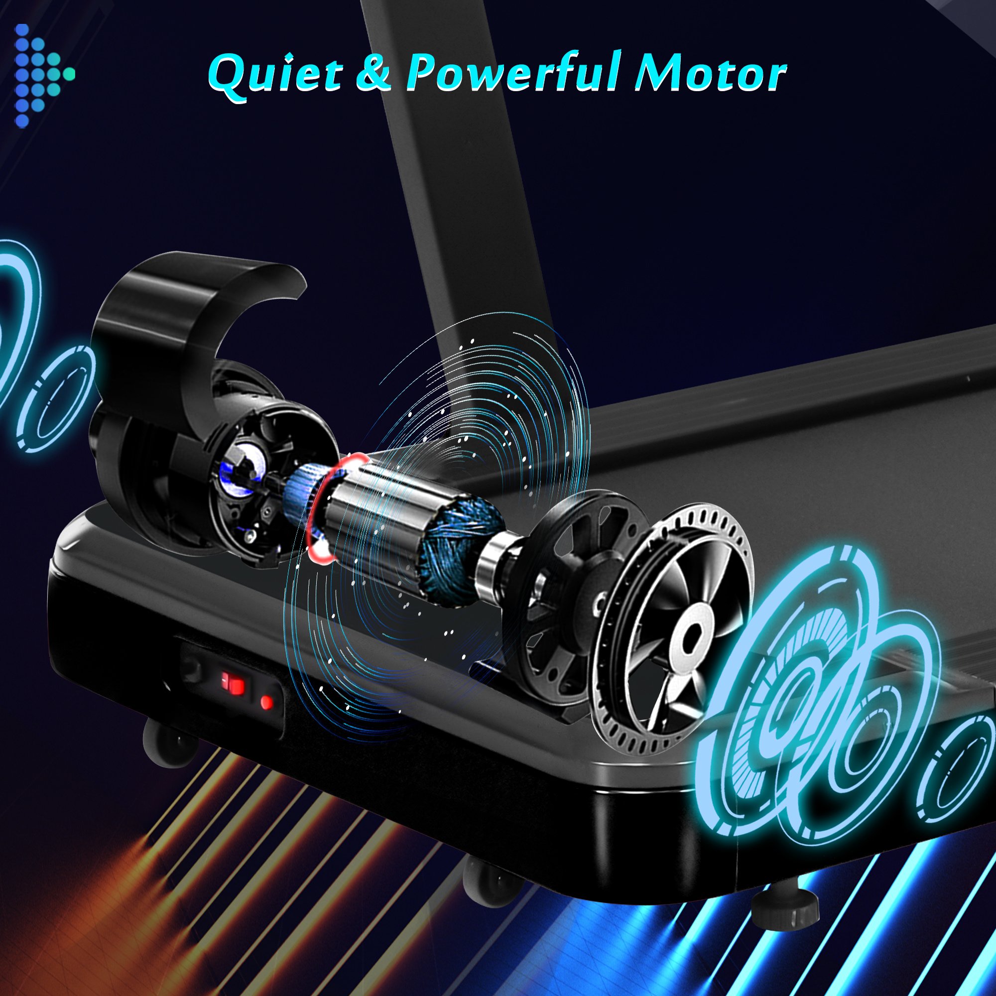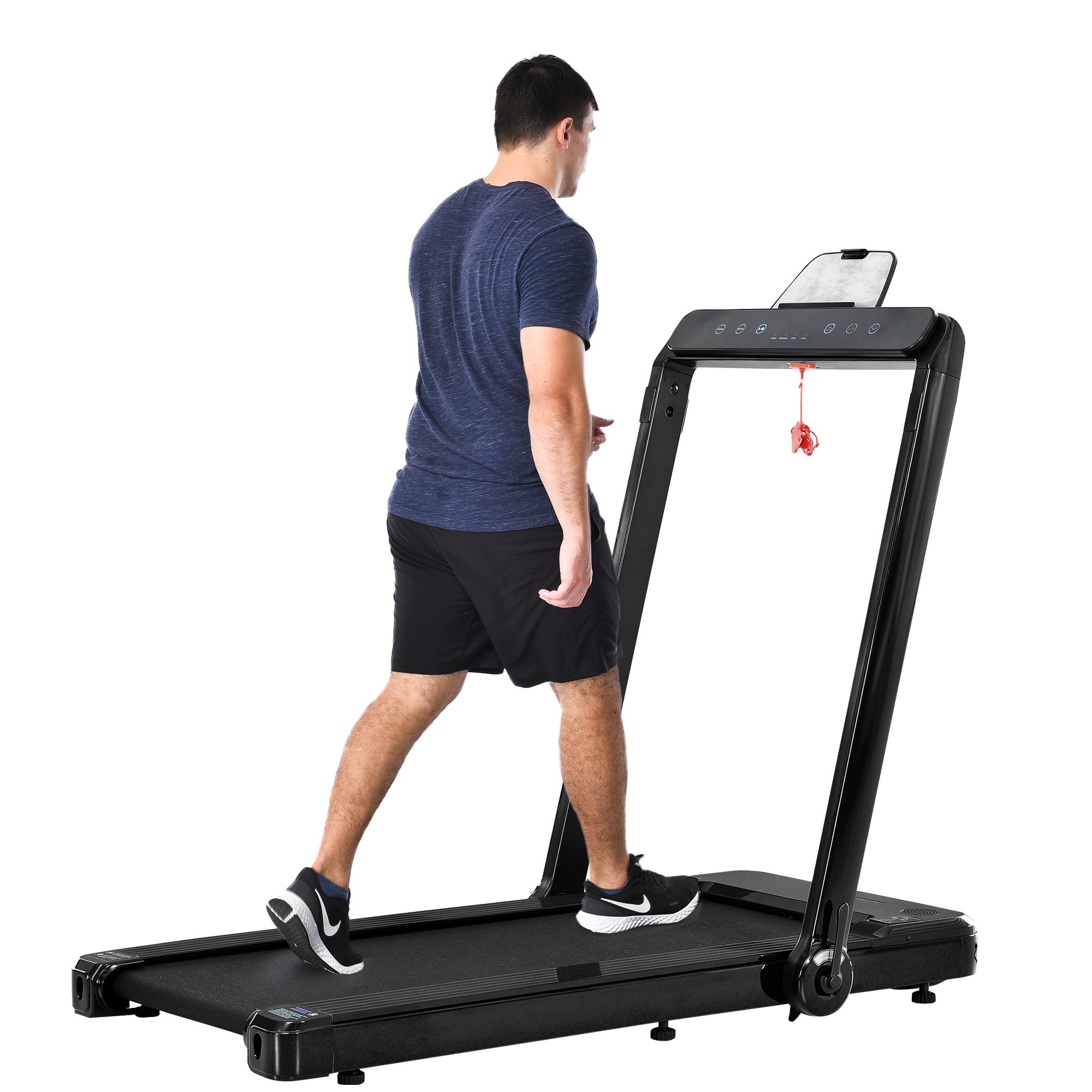 2 Workout in 1 Purchase - This treadmill innovatively combines two functions to meet different needs. When you raise the handrail upright, it can be used as a running machine (speed 0.5-8mph). And it can be a walking machine (0.5-4mph) when you fold the handrail. Just one purchase to get multiple usages.Super Powerful & Extremely Quiet - This 2-in-1 walking running machine is equipped with a 2.5HP motor, while it still can be very quiet and allows you to walk or run without disturbing others, making it ideal for home gym and office use. With a sturdy and durable steel frame and multi-layer running belt, it's shock-absorbing and noise-reducing, making your running quieter, safer, and more comfortable.Smart and Convenience - You can check your exercise data instantly on the LCD display: time, speed, distance, and calories, or you can simply record it on the Bluetooth APP. Also, you can conveniently control the treadmill and monitor via the remote control during exercise.Full Configuration - Up to 12 preset programs, Bluetooth app, speakers, mobile phone stand, and mini remote control, these comprehensive configurations are all installed on this multifunctional walking running machine. You can easily set up your phone or tablet to watch videos while exercising, exercise with friends via video call, or adjust the speed in time with the mini remote control in your hand. You can also sync your workout data with the included app to compare your workout progress with friends!Easy Set & Easy Storage - Equipped with transport wheels as standard on the front side, you can move it to the position you want to store it. Overall size of treadmill: 50.8'' x 27.2'' x 43.3'', complete folded size: 50.8'' x 27.2'' x 6'', it can be easily used as a walking machine under desk.