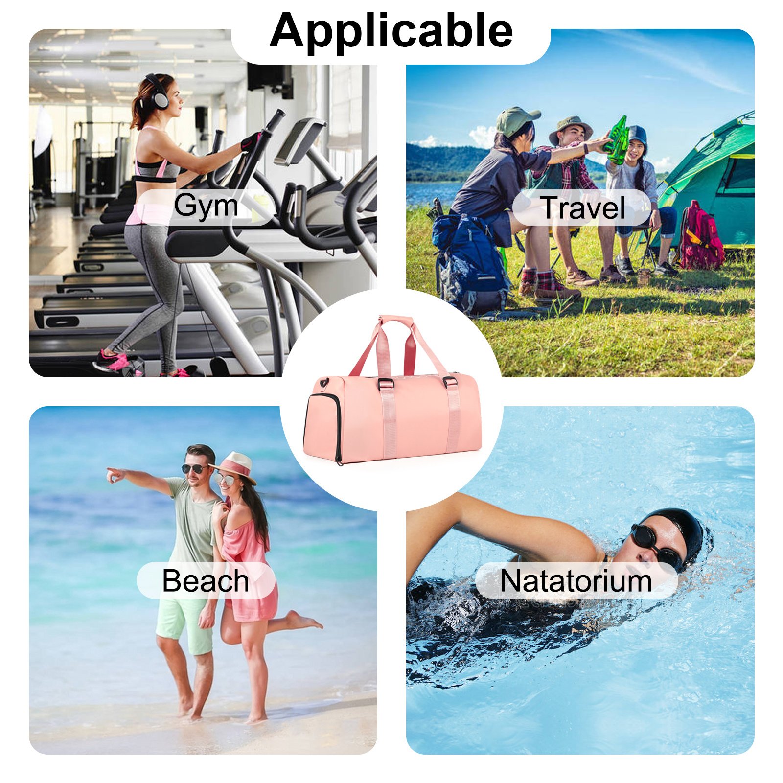 [PERFECT SIZE] This duffel bag is suitable for women, men, and kids. Measuring 19"x9.8"x9.8", it's small enough to carry on or stack it on your suitcase yet big enough for work travel or beach getaway. You can use it for various activities, and sports such as tennis, dance, golf, football, cross fit, and swimming.